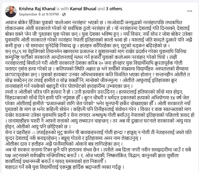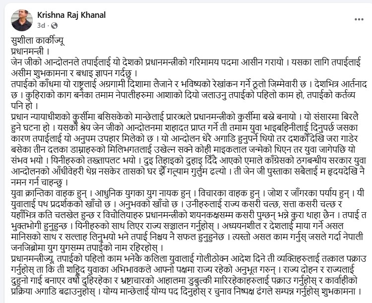 • खनालले ३ दिन अघि अन्तरिम प्रधानमन्त्री सुशीला कार्कीलाई यसरी सम्बोधन गरेका थिए !