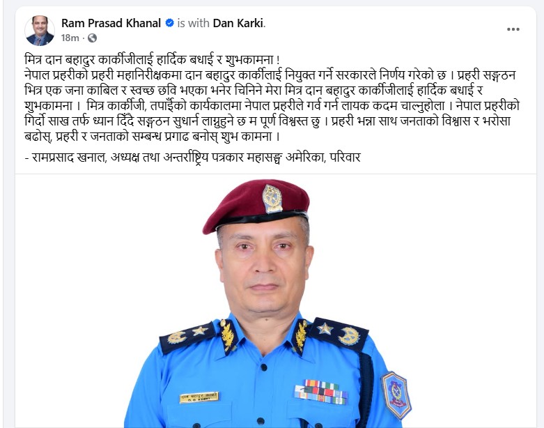 नेपाल सरकारले नेपाल प्रहरीको नयाँ महानिरीक्षक (आईजीपी) मा अतिरिक्त महानिरीक्षक (एआईजी) दानबहादुर कार्कीलाई नियुक्त गरेको छ। सोमबार बसेको मन्त्रिपरिषद् बैठकले कार्कीलाई प्रहरी संगठनको सर्वोच्च पदमा बढुवा गर्ने निर्णय गरेको जानकारी सरकारका प्रवक्तासमेत रहेका सञ्चार तथा सूचना प्रविधिमन्त्री जगदीश खरेलले सार्वजनिक गरे।