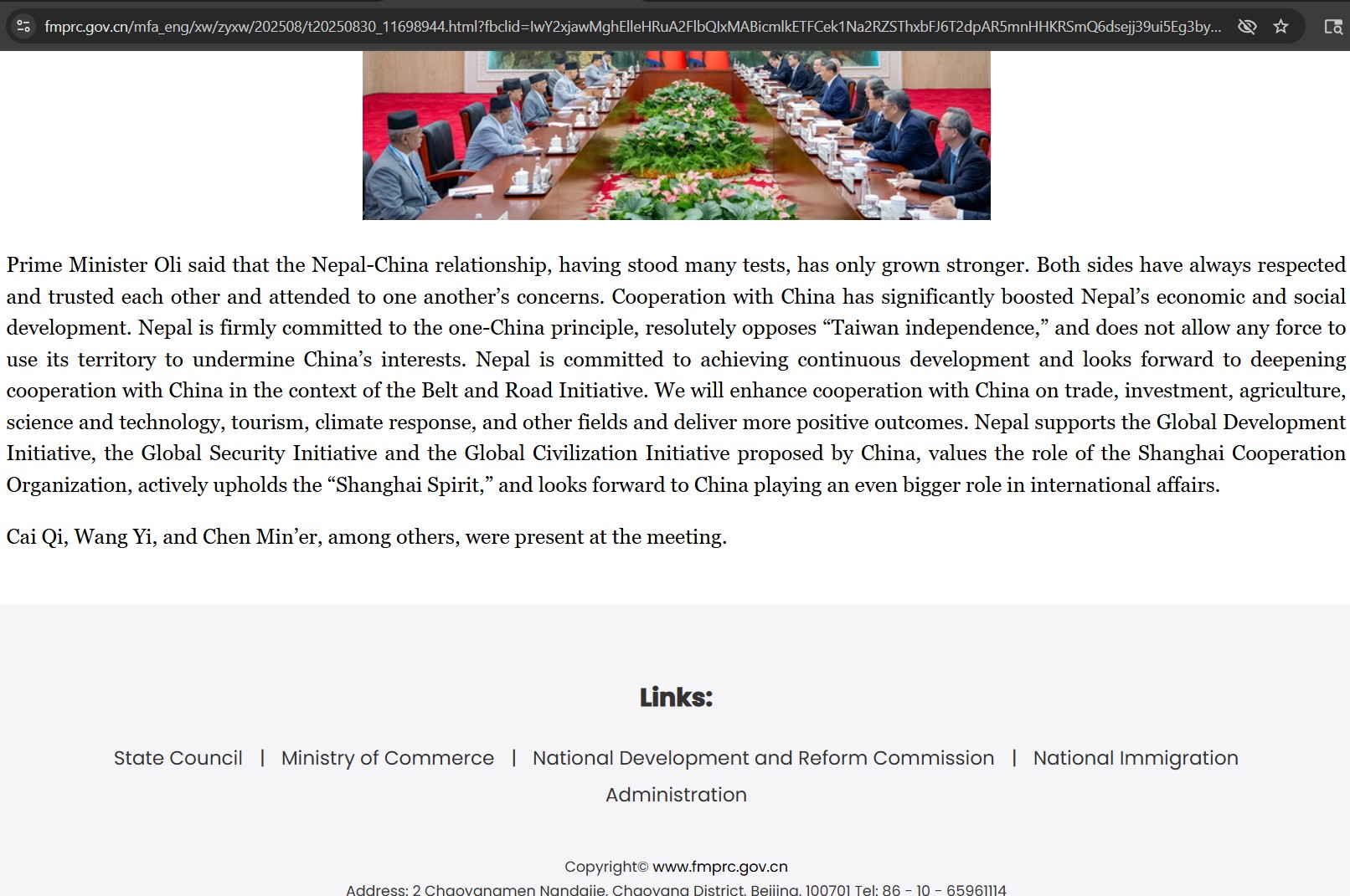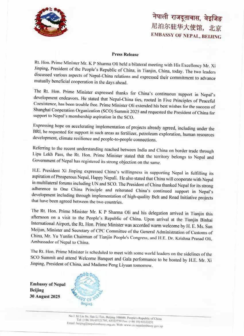 सम्माननीय प्रधानमन्त्रीले नेपालको विकास प्रयासमा चीनले दिँदै आएको निरन्तर समर्थनप्रति धन्यवाद व्यक्त गर्नुभयो। उहाँले नेपाल–चीन सम्बन्ध शान्तिपूर्ण सहअस्तित्वका पाँच सिद्धान्तमा आधारित रही सधैं सहज रूपमा अघि बढेको उल्लेख गर्नुभयो। प्रधानमन्त्री ओलीले शाङ्घाई सहयोग सङ्गठन (SCO) को २०२५ को शिखर सम्मेलनको सफलताका लागि शुभकामना व्यक्त गर्दै चीनका राष्ट्रपति समक्ष नेपाललाई SCO को सदस्यता दिलाउन समर्थन गर्न अनुरोध गर्नुभयो।