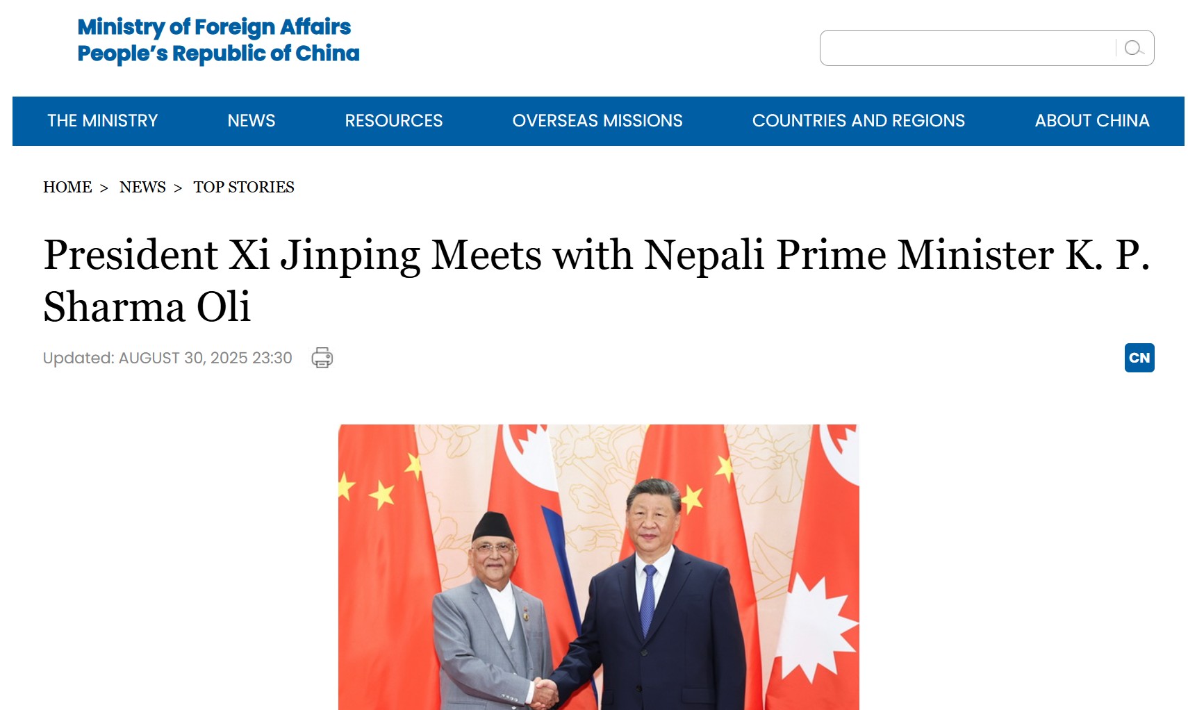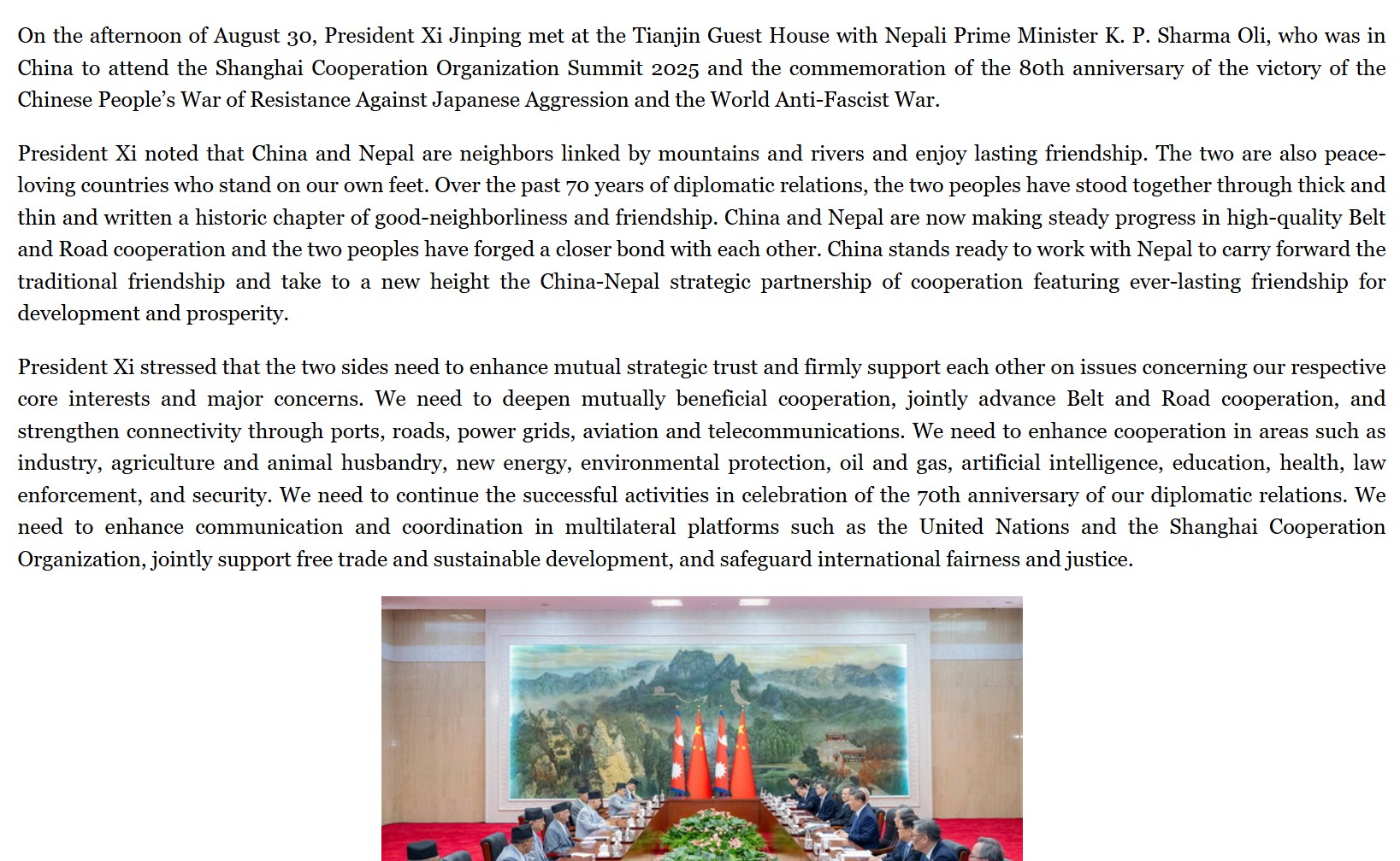 भदौ १३ गते दिउँसो चीनको तिआनजिन गेस्ट हाउसमा राष्ट्रपति सी चिनफिङले शाङ्घाई सहयोग सङ्गठन (SCO) शिखर सम्मेलन २०२५ र चीनको जापानी आक्रमणविरुद्धको जनयुद्ध तथा विश्व फासिवादविरोधी युद्धमा विजयको ८०औँ वार्षिकोत्सवमा सहभागी हुन चीन पुगेका प्रधानमन्त्री के. पी. शर्मा ओलीसँग भेटवार्ता गर्नुभयो।