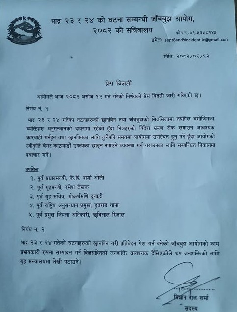 जेनजी आन्दोलन छानबिन आयोगको निर्णय : काठमाडौं / जेनजी आन्दोलनका घटनाबारे अनुसन्धान गरिरहेको जाँचबुझ आयोगले पूर्वप्रधानमन्त्री केपी शर्मा ओलीसहित..